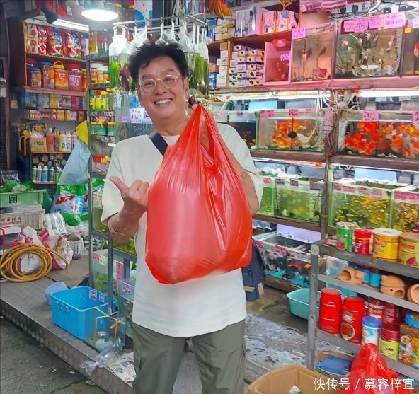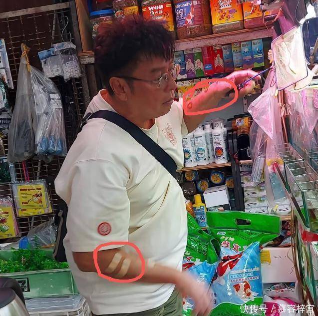 小编从合照中发现他身上贴了不少方块形状的贴纸,不知道是不是他身体出现了什么小毛病。 他真是经常出门啊,9月24号他去一家街边小店买鱼又被偶遇了。